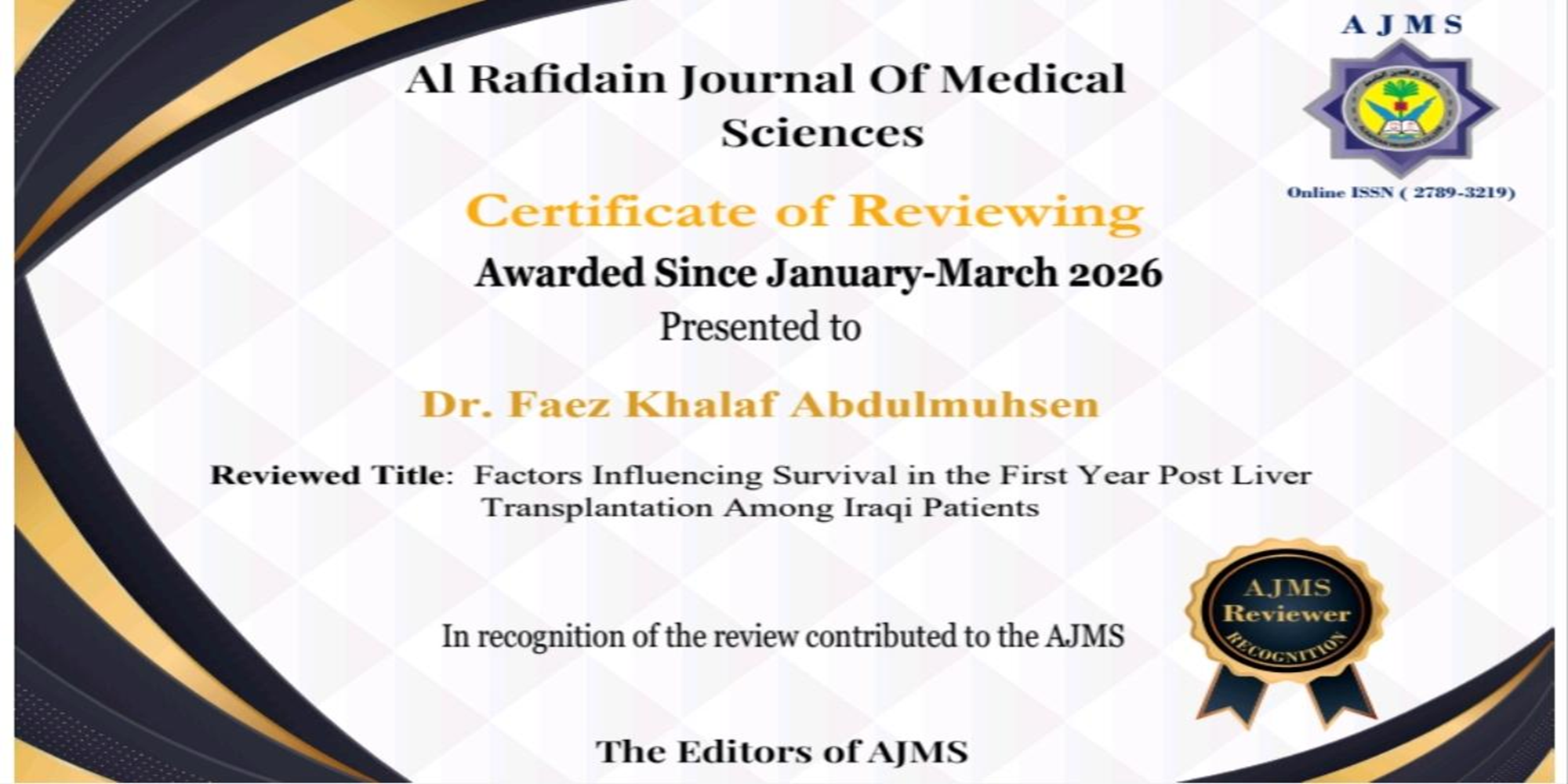 مجلة الرافدين الطبية تمنح أ.م.د.فائز الـسرحان شهادة تقديرية لجهوده البحثيةمنحت هيئة تحرير مجلة الرافدين الطبية شهادة تقديرية للأستاذ المساعد