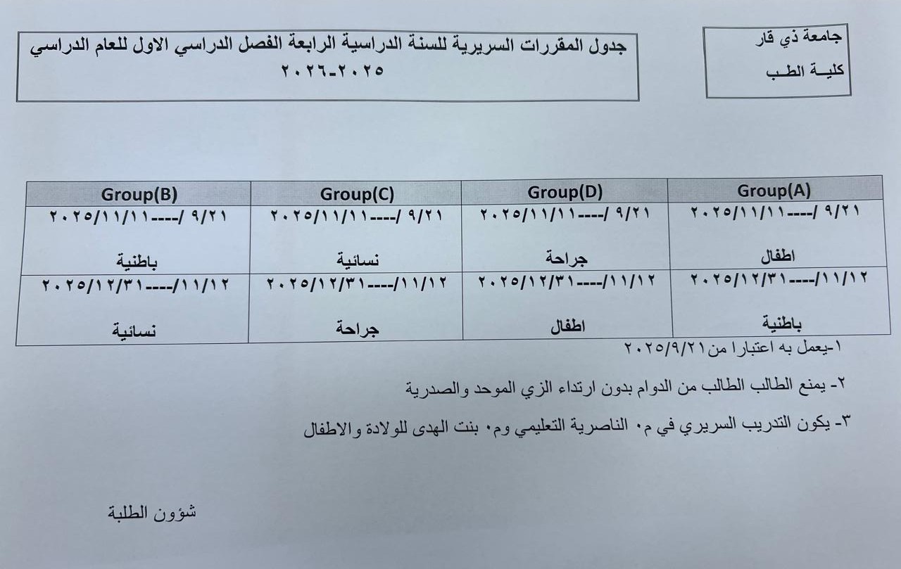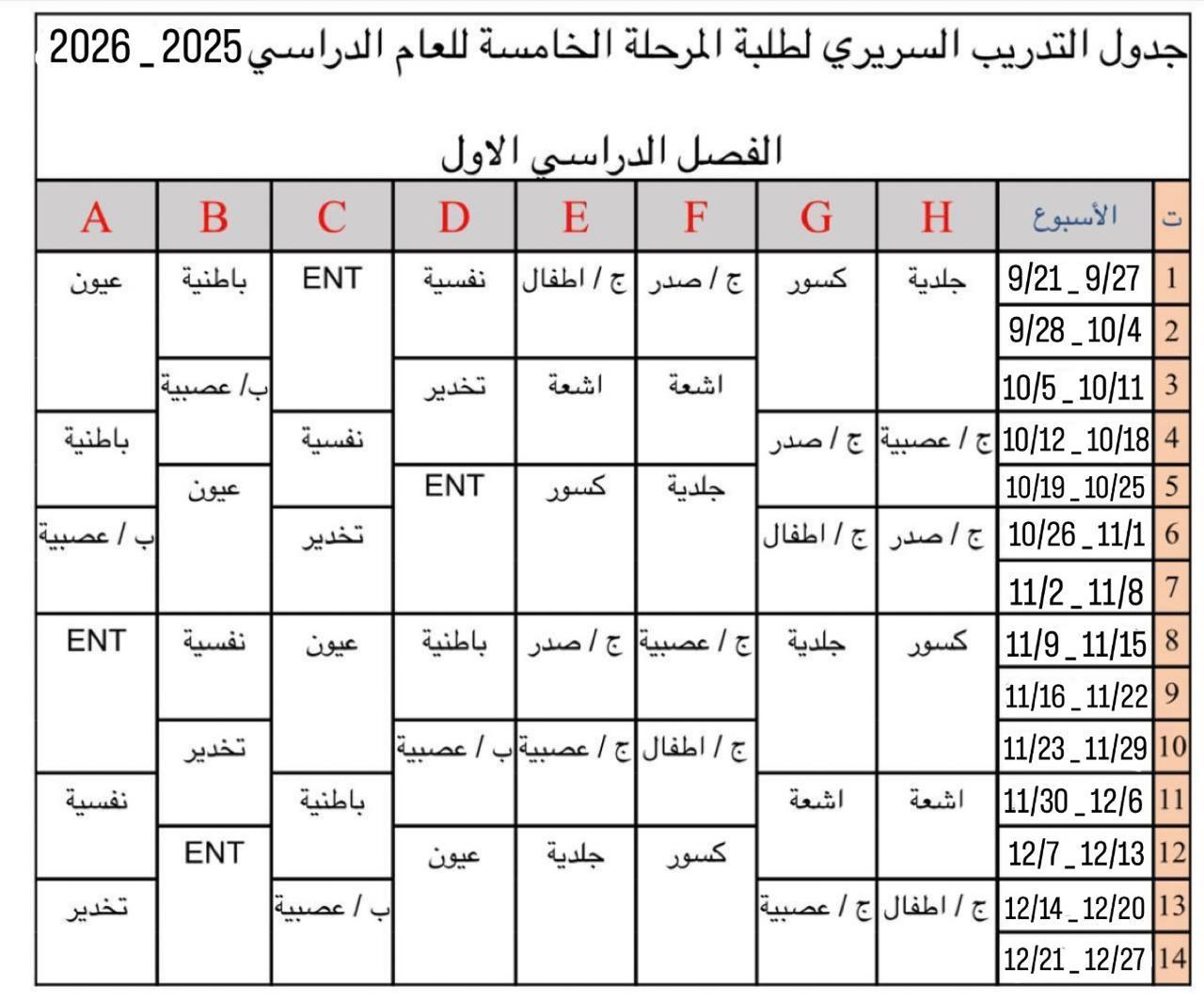 جدول المحاضرات الإسبوعي للعام الدراسي 2026-2025